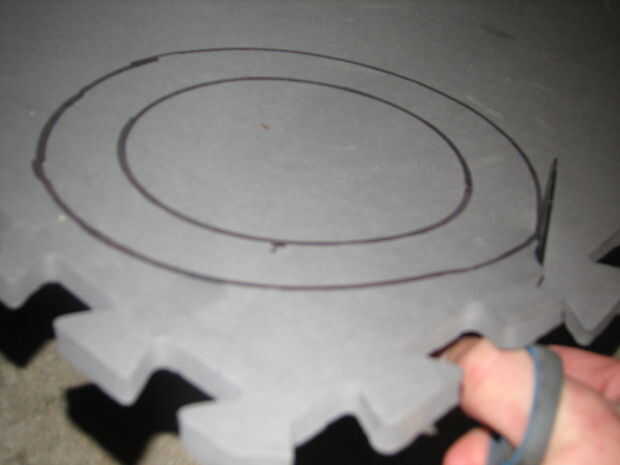El siguiente paso es cortar la rueda de la espuma o lo que sea material seleccionado. Tijeras bien trabajaban pero finalmente recurrí a una estufa de leña para fundir a través de él.