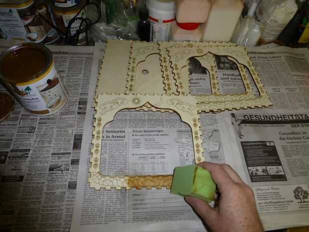 Para un buen acabado utilizamos un papel de lija fino y cubrir las piezas con tinta para madera. Para que pueda ver mejor la estructura de madera.
