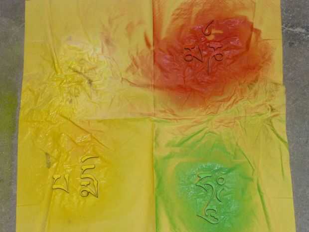 "banderas de oración son coloridos paneles o paños rectangulares a menudo se encuentran colgados a lo largo de cordilleras y picos en el Himalaya para bendecir el campo circundante. Desconocido en otras ramas del budismo, oración banderas se creen pa