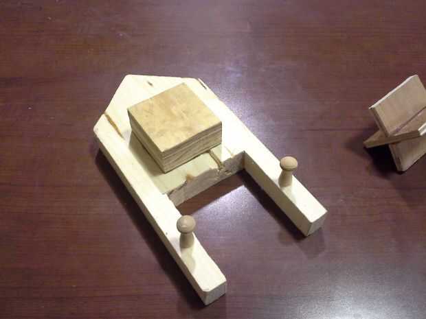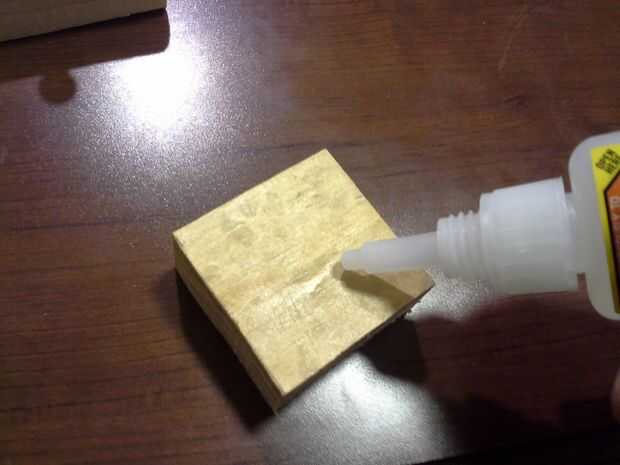 Aplicar pegamento a un lado de la cuadra cuadrada.  Centro de corte rectangular y media pulgada de la parte trasera del lugar.  Fije el bloque.  Aplicar ligera presión y espere 1-2 minutos para el pegamento se seque.
