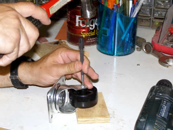 Primero usted debe deshacerse de la rueda. Uso eléctrico taladro hacia fuera del eje de la rueda (puede que necesite utilizar un punzón de metal o juego de clavos a la broca un lugar para empezar). Asegúrese de que está utilizando una broca para metal. Si esto no funciona uso y molino eléctrico para moler fuera uno de los extremos del eje. Una vez uno de los extremos ha sido apagado o perforado hacia fuera, el eje debe deslizarse por el otro lado y se puede quitar la rueda.
