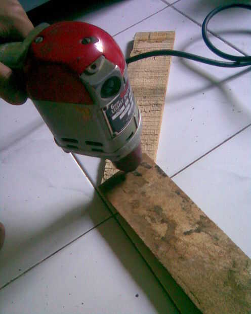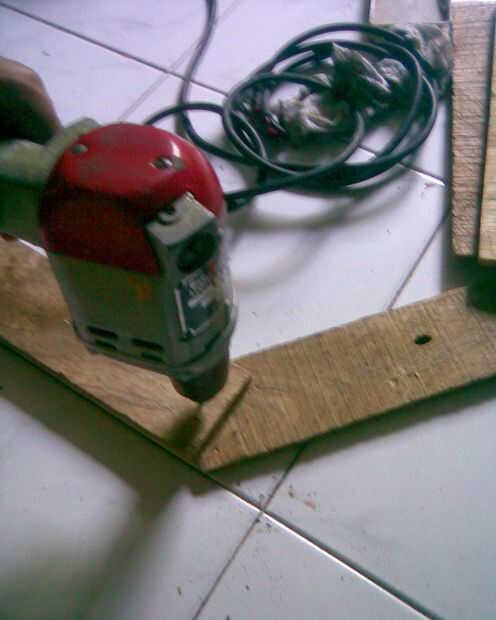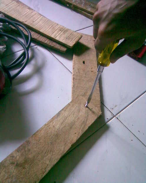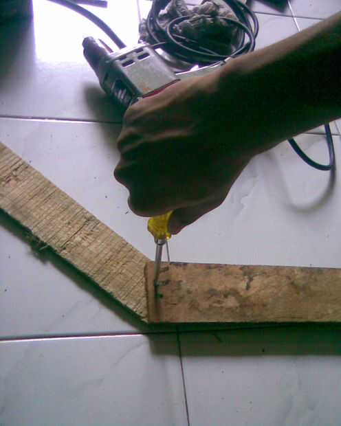 EN segunda, tercera, cuarta, Quinta, sexta y séptima imagen después de colocar la madera registros sobre mutuamente y perforación agujeros en él, me fijo los troncos de madera a cada uno otro con 19mm tamaño del tornillo.