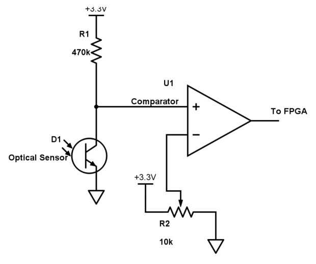 El codificador óptico fue creado mediante la colocación de cinta negra en rayas alrededor del exterior de la rueda volante. Luego una línea que sigue el sensor fue utilizada para detectar la presencia o ausencia de cinta negra. Esta señal debe ser amplificado y requiere un tablero amplificador personalizado. En esta sección se muestra el esquema para este tablero. La salida amplificada se alimentó luego hacia el FPGA de la Junta de Zynq.