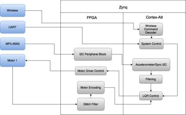 El código fue dividido entre la tela de la FPGA y el ARM Cortex-A9 CPU en el chip Zynq. La tela FPGA fue encargado de hacer salir una onda PWM al motor, así como filtrar y lectura de la velocidad del motor.