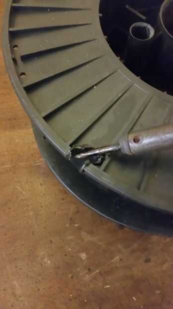 Aquí yo sólo uso mi soldador para derretir una ranura en el lado de la rueda de alambre. Hacen lo suficientemente amplia para que el cable encaja en apretada, para que no resbale de la ranura sin que tire. Puse ranuras en ambos lados de la rueda de alambre para sujetar ambos extremos de la cuerda.