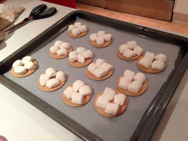Primero coloque 12 de las galletas María y malvaviscos de cortar por la mitad y poner 4 1/2 sobre cada galleta.