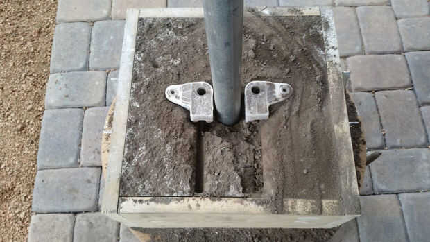 Una vez que las piezas originales han sido preparadas, llenar la parte inferior la mitad del molde con arena verde lleno. Luego cubrir las partes originales con talco y situado en la parte inferior la mitad del molde. Empuje las piezas con el eje 3/8" acero y apuntando hacia arriba. Pulse en la arena hasta que el árbol sólo se entierra. La parte superior de la mitad de la charnela de dirección, incluyendo la conexión de la barra de lazo, debe estar por encima de la arena. Deje suficiente espacio entre las dos partes para un tubo de 3/4" que creará el túnel de llenado.