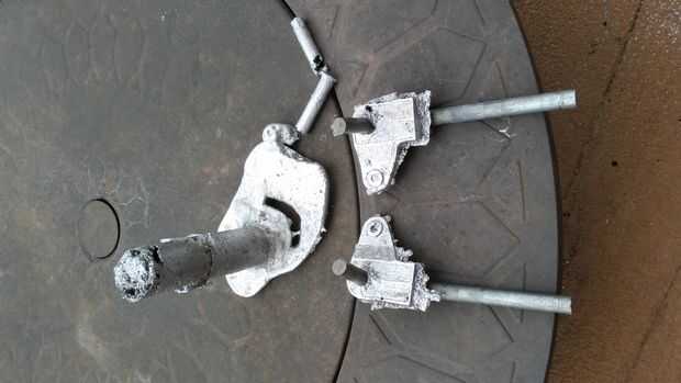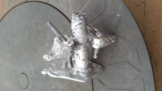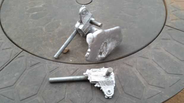 Debe tener dos nudillos de manejo con los ejes de acero integrados conectados a la canalización vertical. Una amoladora para derribar el áspero los cantos que se forman donde se encuentran la costura entre las dos mitades del molde y usé una sierra para metales para separar los nudillos de manejo de la canalización vertical. Entonces solo haga un agujero para los tirantes y listo ir.