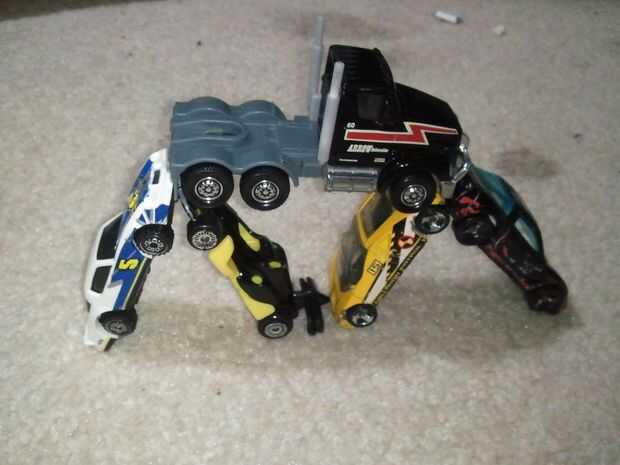 Pila un coche grande encima de los 2 triángulos. Asegúrese de no los derribarse!
