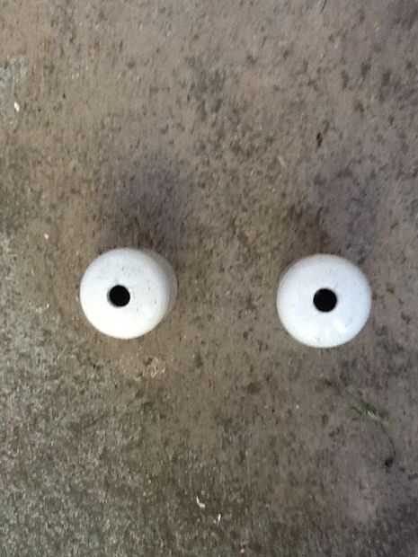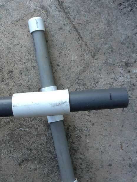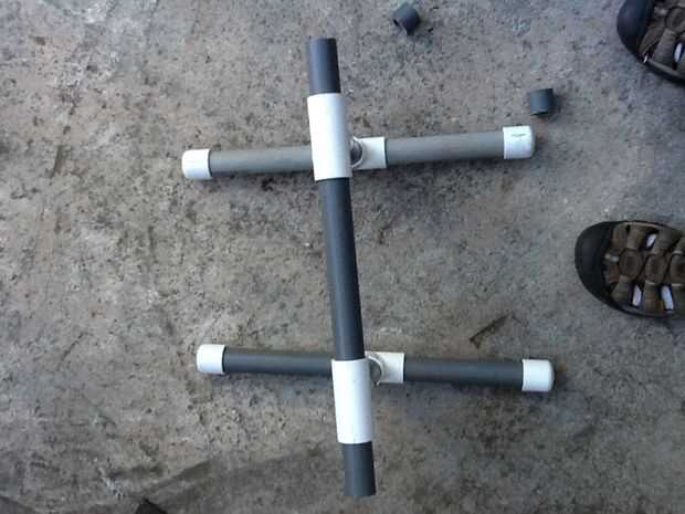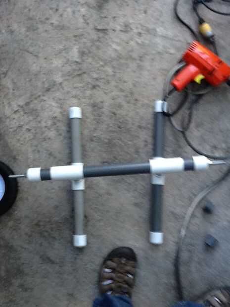 Pegar dos piezas de tubo de PVC en los huecos vacíos de las uniones T y mida 2.5" a cada lado. Luego corte en la marca. Con las dos últimas tapas perfore un agujero a través del medio. Coloque las tapas con orificios en el extremo en el tubo de PVC. Recorren el tubo de PVC con el poste roscado y apriete las tuercas. Después de ese hilo en una lavadora luego la rueda luego otra arandela entonces al final tapa tuerca. Hacer esto para el otro lado y su hecho!