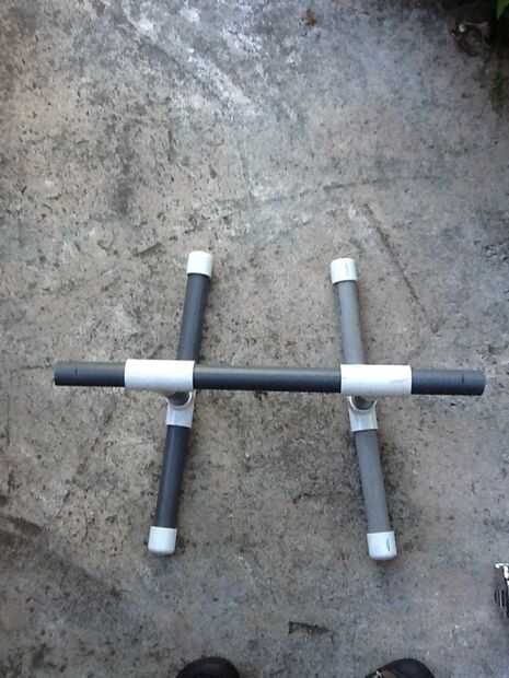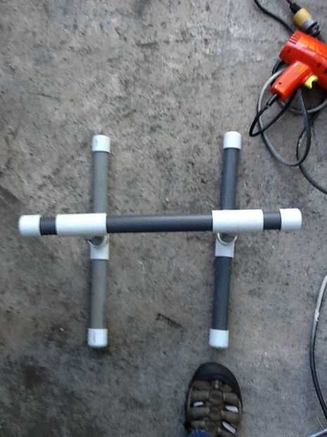 un carro de kayak sencillo realizado en tubo de PVC. Para fácil desmontaje para su transporte.Es ligero y cabe perfectamente un kayak sit on top de Ocean Kayak Malibu II. Si tienes un kayak diferentes, únicamente tiene que ajustar la distancia entre