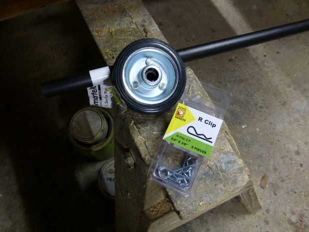 Empezar con un par de ruedas pequeñas (estos son de 75mm de diámetro y tienen cojinetes), varilla de peso ligero 200mm más ancha que la base de la mochila para el árbol (utiliza barra acero inoxidable donados de una tienda de iluminación - verificación caben las ruedas), un paquete de pequeños Clips de R y un pequeño tramo de tubería a utilizar como separador en el eje.