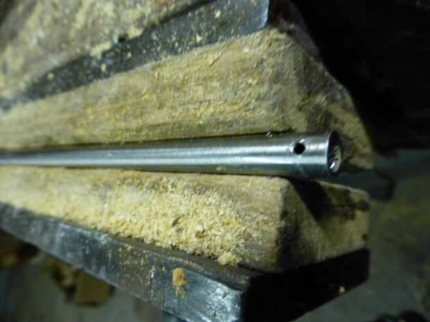 Perfore un pequeño agujero de unos 5mm de un extremo de la varilla. Esto puede ser complicado asi que tengan paciencia para evitar marcar la barra de acero. No cortar la varilla aún.