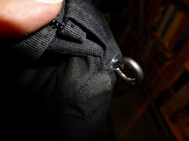 Con un objeto punzante fuerte por ejemplo un de tamaño mediano aguja de tejer (usted puede comenzar con un pequeño pincho), hacer un agujero en la bolsa, poner una arandela en el perno de argolla y meter el extremo del perno de la armella a través de-esto podría tomar un poco de trabajo pero trata de manejar sin hacer un corte en la bolsa.