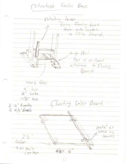 Como se puede ver mi plan crudo requiere una caja de madera que se sentará en el borde superior de los pies y entre los dos montantes de soporte. El plan original llamó para un pedazo de tubo o hilo todos conectados a un tablero y a través de dos lados de la caja como un punto de bisagra para las ruedas. En el otro extremo del tablero hay una manija unida a la viga transversal más baja para actuar como una palanca para forzar la Junta hacia abajo y levante el soporte sobre las ruedas y mientras que esto habría funcionado se me ocurrió una manera ligeramente diferente para hacer la misma tarea después de que la caja sí mismo fue construida.