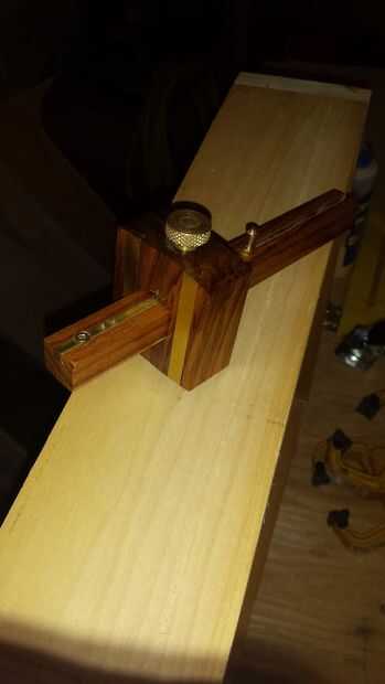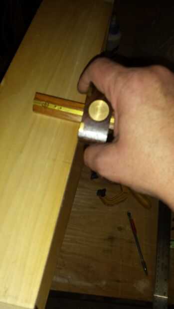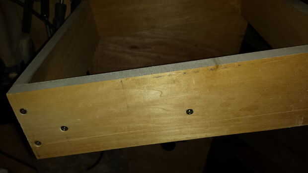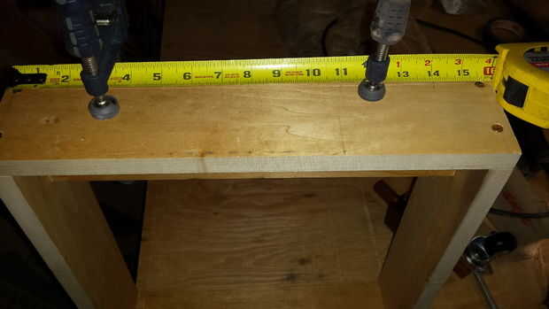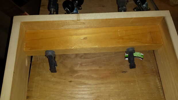 Usé mi gramil para marcar una línea en el interior y el exterior de la caja. Corté las calas a 16 pulgadas de largo en mi sierra (no tengo fotos de esto). Luego usé mi cinta métrica para marcar tres puntos a cada lado de la parte exterior de la caja. Uno en el centro y dos un par de pulgadas en el exterior de la caja y uno y tres cuarto pulgadas arriba de la parte inferior. Tomé una de las dos calas y alineados cuidadosamente la parte inferior de la misma con la línea de una pulgada había marcado en el interior de la caja y sujeto con dos abrazaderas.