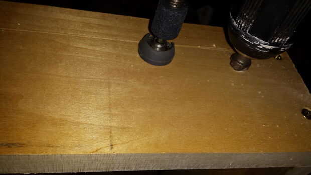 En este punto decidí el tablero flotante sería realmente flotan dentro de la caja y la bisagra en el centro en lugar de conectado y con bisagras en un extremo. Presionando en el centro de la placa flotante los extremos podría empujar contra un conjunto de calas unido a la carcasa de la caja. Esto levantar el soporte y fijar el peso de la sierra y el soporte sobre sus ruedas nuevas. Con este nuevo plan en mi cabeza, pero no elaborado que se puso a trabajar.