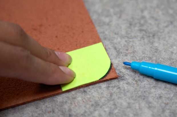Porque esquinas tienden a tomar más de una paliza, opté por redondear las esquinas de la bolsa haciendo primero una plantilla de papel de grado curvo, luego la dibujo en el cuero sí mismo. Luego, con un exacto (o mi navaja suiza práctico) corte las 4 esquinas.