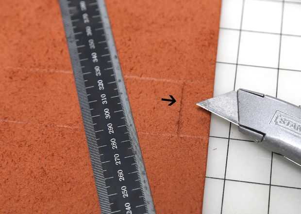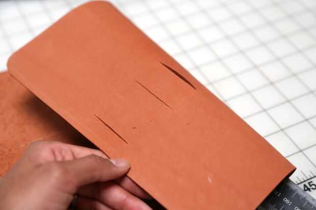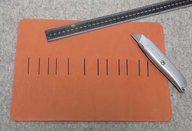 Usando un borde recto y un exacto, empecé a cortar aberturas verticales entre las dos líneas de tiza que había dibujado en el paso anterior. Hasta qué punto aparte esos cortes son ser grueso como un instrumento se puede colocar dentro de ese eje. Sin embargo, recuerde que cada otra hendidura será donde el cinturón recibe almacenamiento roscado a través al otro lado y por lo tanto no utilizable para un instrumento. Hice un total de 14 cortes.