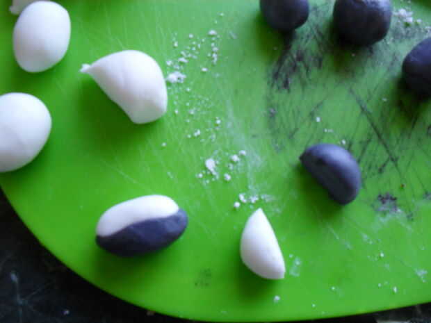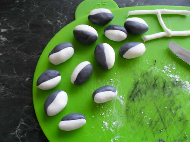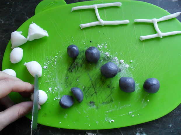 Para las reglas del juego, sólo extienda algunos (fondant) con las manos y cortar 24 largo "salchichas" y los cortos 12. Las pelotas de rugby son un poco más difíciles. Coge un trozo más grande de pastillaje (fondant) y dividirlo por la mitad. Color cada mitad en los colores del equipo (para mi es blanco y negro) cada color, entonces divida en 6 formas de esfera. El colorante de alimentos hará que el hielo mojado, así que añadir azúcar glas para mantenerlo firme. Cortar cada esfera por la mitad, luego seguir con una media de otro color. Hacerlas rodar juntos en tus manos y hacerlas ligeramente oval como pelotas de rugby.