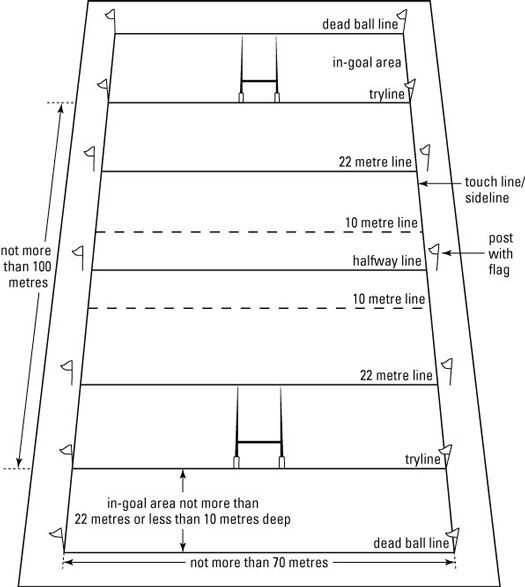 Además de las líneas de touch (al margen de todos los aficionados al fútbol por ahí que está leyendo esto), son las líneas de pelota muerta en los extremos de las áreas en el objetivo (a.k.a. el try-zone). La línea de prueba es generalmente 10 metros en la línea de balón muerto. La línea de prueba es la línea que divide la zona de prueba desde el campo de juego. 22 metros desde la línea de balón muerto es el * gasp * línea de 22 metros. Esto es donde se toma una patada si un equipo toca el balón hacia abajo en está línea de prueba propios (que no pueden correrlo detrás en su propia zona de prueba).