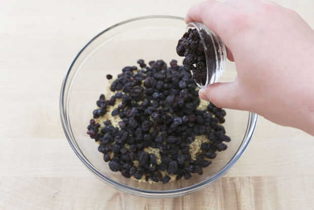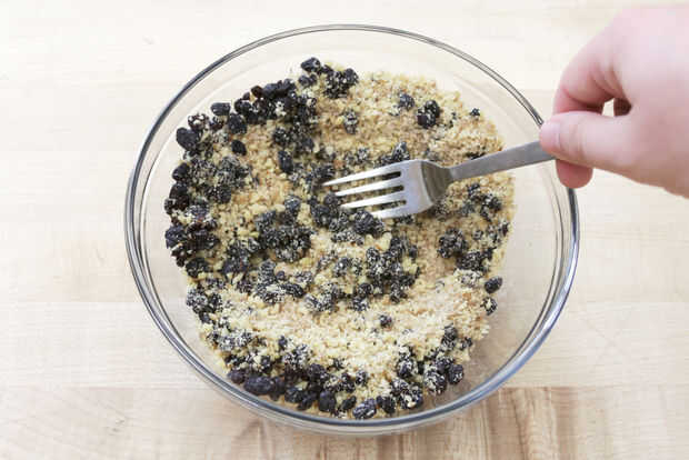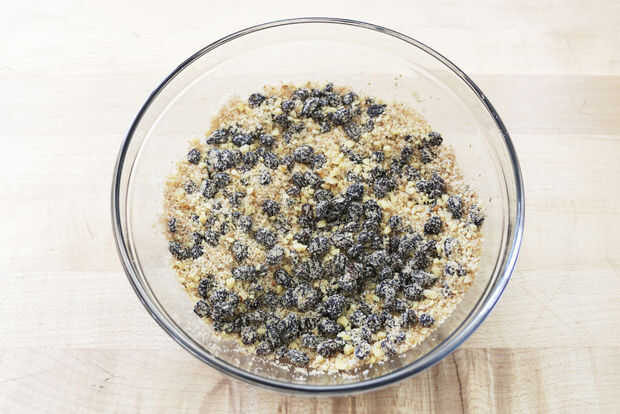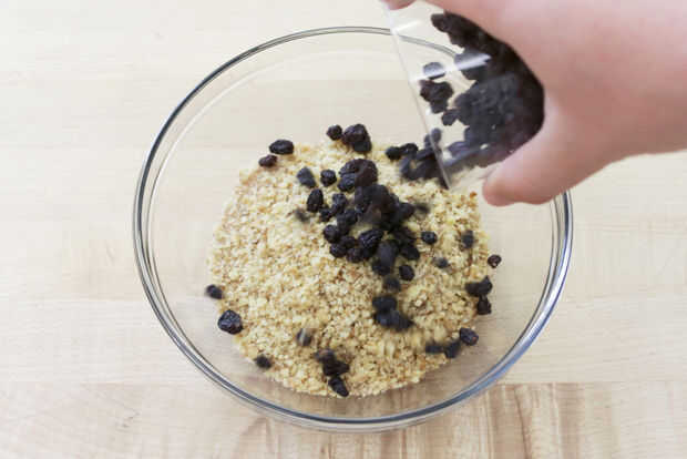 Mezclar las nueces, las pasas de uva y corrientes en el relleno.