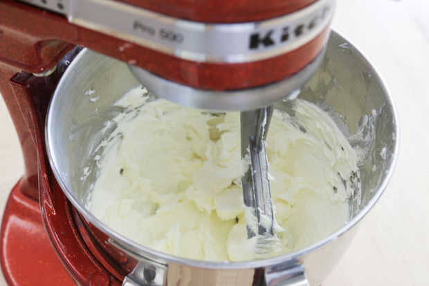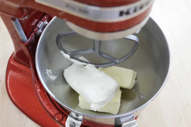 Empezar a hacer la masa mezclando el queso crema y la mantequilla en una batidora a velocidad media. Debe empezar a conseguir liviana y esponjosa.