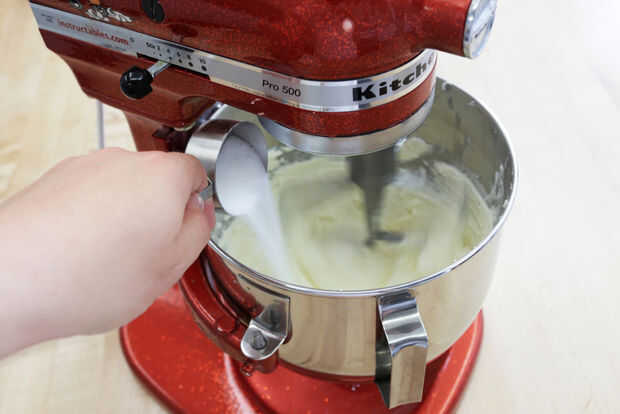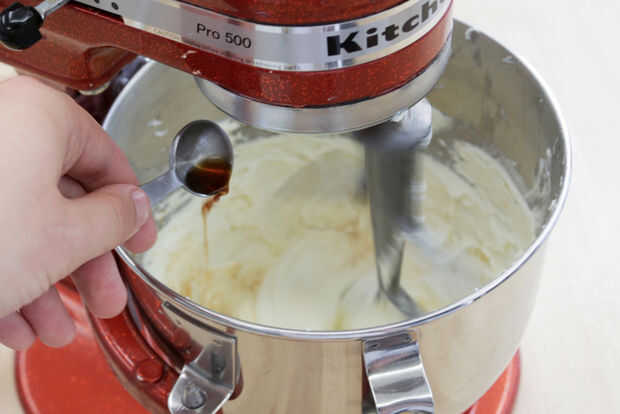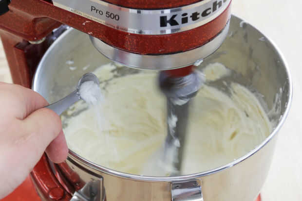 Añadir 1/4 taza de azúcar, una cucharadita de vainilla y 1/4 cucharadita de sal a la masa. Continuar a batir la mezcla a una velocidad media.