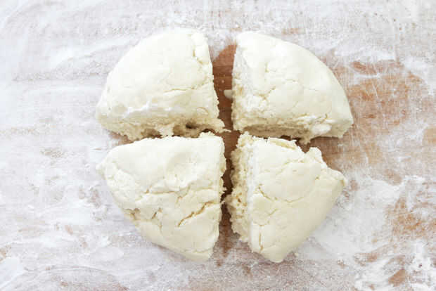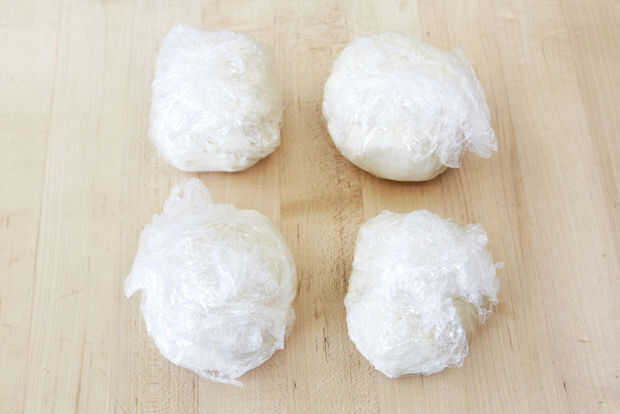 Cortar la bola en cuatro cuartos y envolver cada sección de envoltura de plástico.
