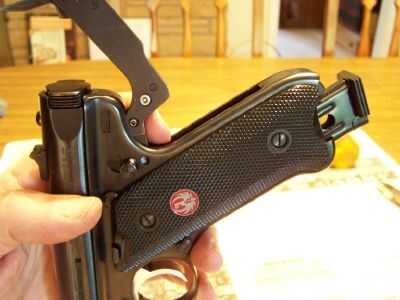 Sostenga la pistola con el cañón apuntando al suelo.  Compruebe para asegurarse el puntal del martillo sobre el crosspin, no adelante de él, que está por debajo de ella.  Inserte el perno perno de retención en los orificios para él y presione hasta que asiente completamente.  (Nótese cómo el extremo redondeado del perno de retén del perno se extiende por encima de la superficie superior del cañón).  También, colocar un cargador vacío en mango de la pistola.  Encájela en su lugar.