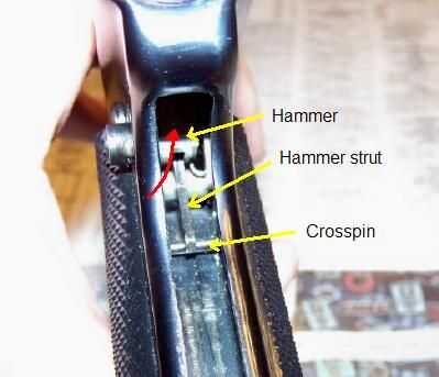 La vista en la foto es en la parte posterior del mango de la pistola. Las flechas amarillas identificación de las partes. Gran parte del martillo está en sombra. Cuando el martillo se mueve, el puntal del martillo fácilmente cae adelante del crosspin. Empuje el martillo en la dirección de la flecha roja. Las puntas de los alicates de punta o un destornillador pequeño funcionan bien para esto. Punto del cañón de la pistola hacia arriba para que el martillo del puntal puede caer hacia la parte posterior de la pistola por delante el crosspin (como se muestra en la foto). Ahora el perno debería ser libre a deslizarse hacia fuera si no era antes.