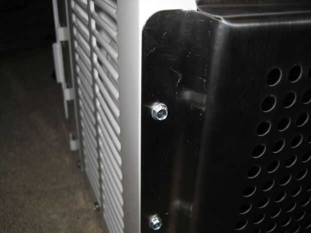 Las tres agujeros perforados en el labio de la cubierta de la parrilla por ambos lados ya que los tornillos no perforen el acero inoxidable. Luego se deslizó el labio superior de la cubierta de la parrilla debajo del reborde de la chapa en la parte superior de la unidad de CA y utiliza seis, tornillos autoroscantes cortos para atornillar la cubierta de la parrilla en la parte posterior de la unidad de CA. No utilice tornillos largos o corre el riesgo de perforar la tubería interior que contiene la CA de cobre refrigerar. Brillar una linterna a través de los respiraderos laterales para asegurarse de que usted no atornillar en cualquier cosa que no sea de metal de hoja.