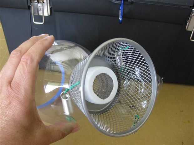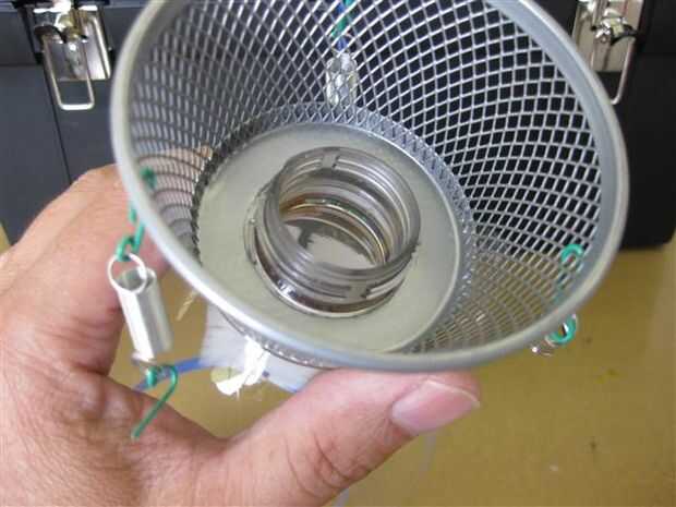 Usé un serrucho para cortar un agujero en la parte inferior de la pequeña papel sostenedor del clip. Cortar a un ligero sobredimensionadas en relación con la dimensión exterior de la boca de la botella pop. Esto me permitió usar los hilos de rosca de la boca para montar la parte pequeña de la jaula. También he añadido 3 asambleas de primavera.