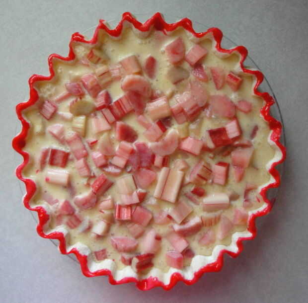 En un bol grande combinar mantequilla, azúcar, harina, huevos, jugo de limón, vainilla y sal hasta que esté suave. Añadir ruibarbo en rodajas y mezclar bien.