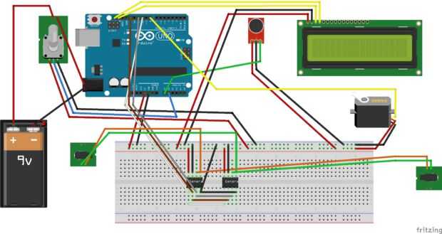 El funcionamiento básico del circuito es el siguiente: el interruptor sobre el potenciómetro conecta la batería de 9V para el enchufe de alimentación de Arduino permitiendo ejecutar gratis desde el ordenador. El Arduino lee la señal del micrófono y el potenciómetro en A0 y A1. Arduino controla el servo del pin 8 y pines 10, 11 y 13 se utilizan para la comunicación SPI a los potenciómetros digitales. Los 2 potenciómetros digitales están conectados con el mismo pin de selección esclavo para que los dos reaccionan juntos. Uno de auriculares en la entrada para la música y el otro es la salida que se puede enganchar en su estéreo. Las señales de música jamás a través de Arduino, sólo a través de las ollas digitales. De esta manera siempre son señales analógicas y no están digitalizados.