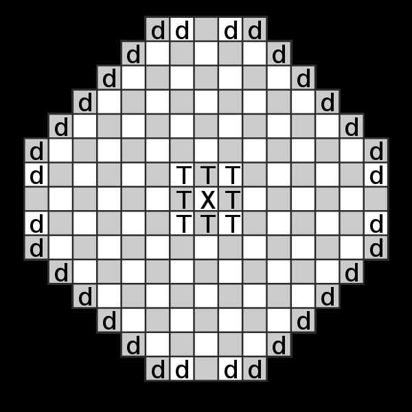 El diagrama muestra posiciones iniciales del juego. "d" representa a los enanitos, "T" representa a los trolls, y "X" representa el Thudstone.