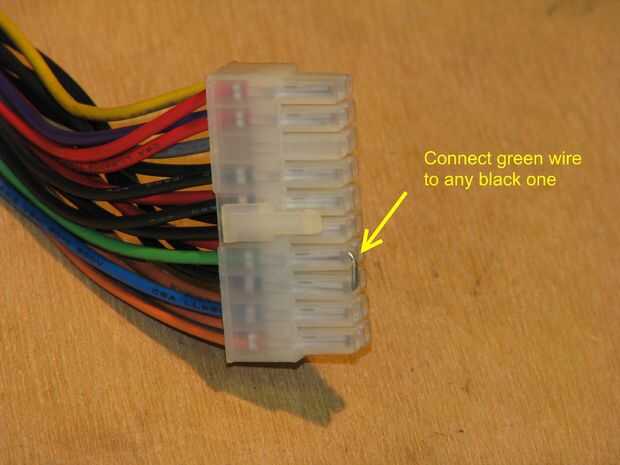Si el conector grande de la fuente de alimentación tiene un cable verde en la posición mostrada en la foto, conecte un cable de enlace a él y a uno de los cables negros al lado. Este es el cable que iría al botón de encendido y debe estar conectada a tierra para encender la fuente.