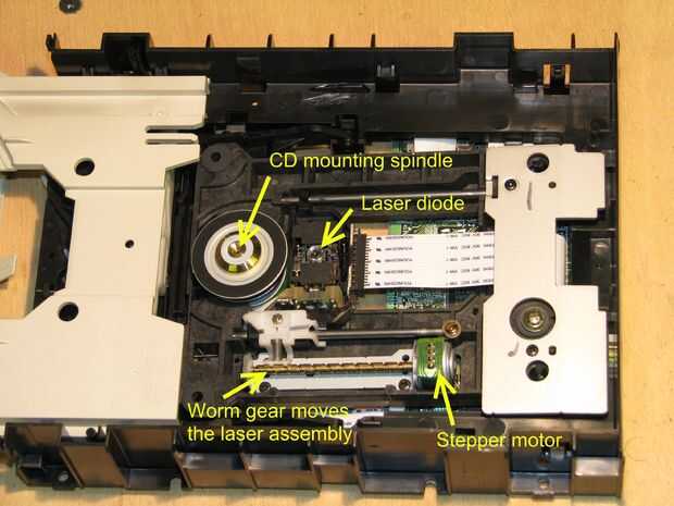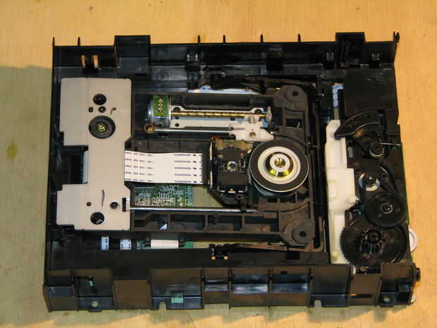 Lo que queremos hacer es quitar la tapa y la bandeja de la unidad de CD para que podamos ver lo que está sucediendo dentro de la unidad. Allí, por lo que no mira directamente hacia abajo en el conjunto cuando está en funcionamiento es un láser de baja potencia. Una vez tenemos el disco de la luz laser se bloquearán.