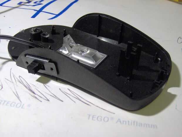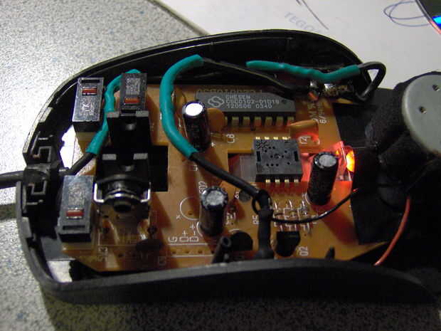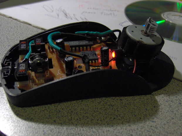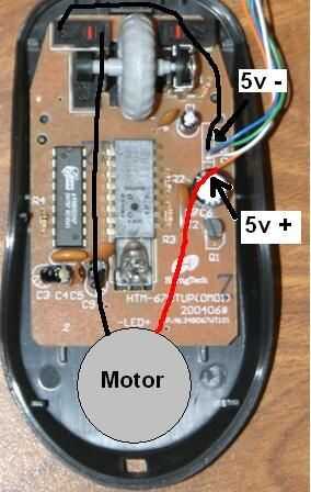 Poner el motor en marcha y pegamento caliente, asegurándose de que no es un cortocircuito hacia fuera de los circuitos en el ratón.