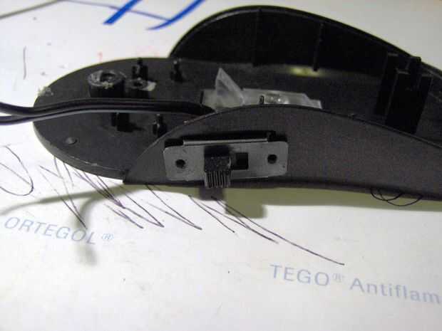 Taladre un agujero en el lado derecho del ratón y hacia fuera de archivos que podemos encajar el interruptor. Pegamento caliente en el lugar.