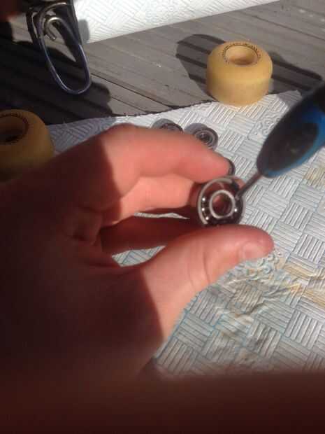 Cuando tengas unos todos sus rodamientos de las ruedas, voltee el cojinete y desmonte la cubierta de plástico transparente mantiene los rodamientos en posición (esto es el retenedor). Utilice un destornillador pequeño que puede caber por el palique entre los rodamientos de bolas y el caso. Cuando es apalancar hacia arriba en un lado salga todo. Puede ser frágil así que si se siente duro hacer esto suavemente. Luego colocar el destornillador entre los rodamientos de bolas y extraer la junta tórica debe caerse fácilmente