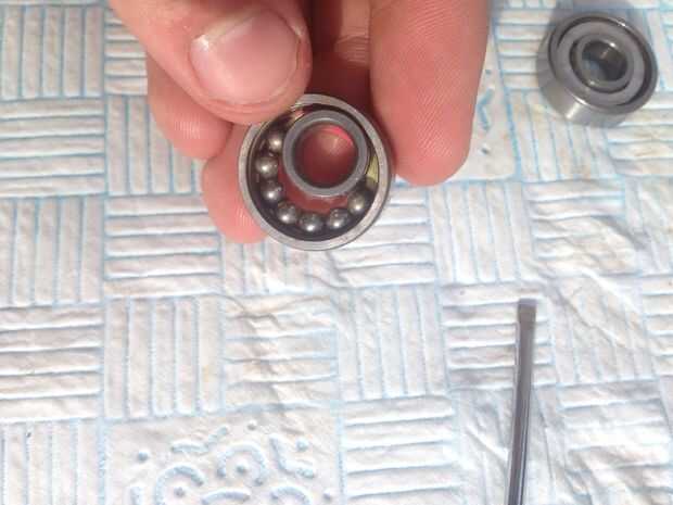 Seco el protector de goma y colóquelo de nuevo en un lado del rodamiento deberá hacer clic en cómodamente. Entonces empezar a colocar los cojinetes en el lado de la caja. Mantenga el cojinete plano para hacer más fácil esta parte. A continuación tomar el anillo interior y colóquela en la parte superior de las bolas y deslice hacia abajo hasta que haga un clic. Coloque el lado protector de cojinete abajo en el piso y usar el destornillador para difundir hacia fuera de los cojinetes para el retenedor hacer clic en. Cuando las bolas se separan hacia fuera uniformemente empuje el retenedor en la parte trasera, asegurándose de que cada bola va en cada espacio por separado. Utilizar algún lubricante lubricante o máquina de coser patinaje engrasar los rodamientos y su listo para ir.