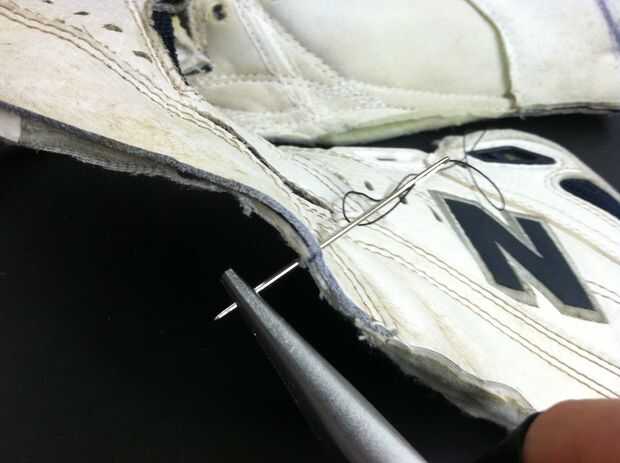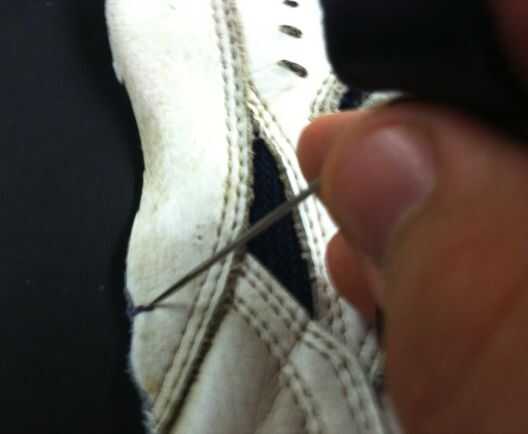 7. comenzar la puntada por la perforación del cuerpo del zapato. Corte el hilo extra desde el nudo.