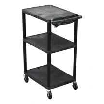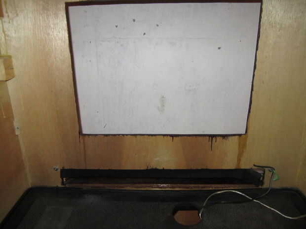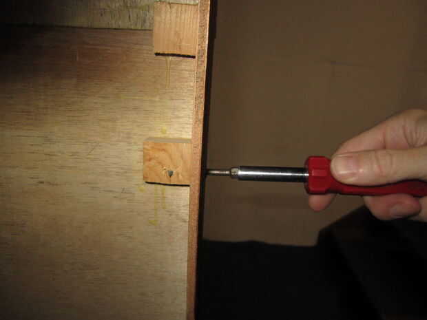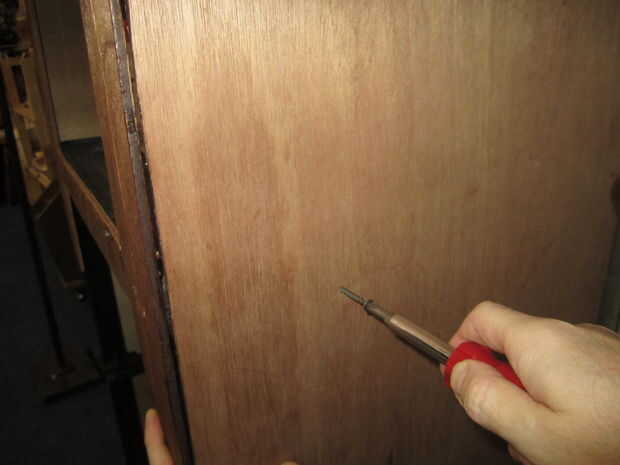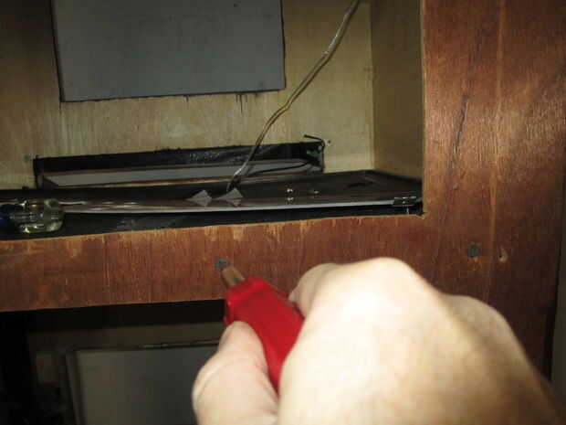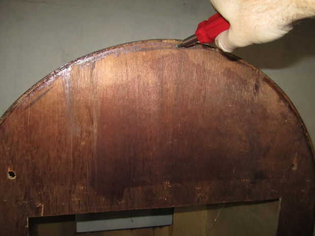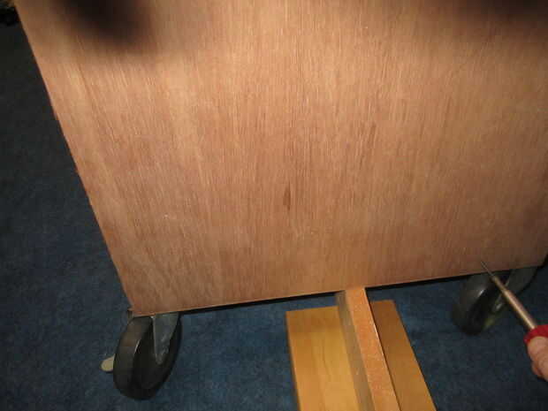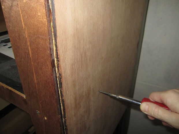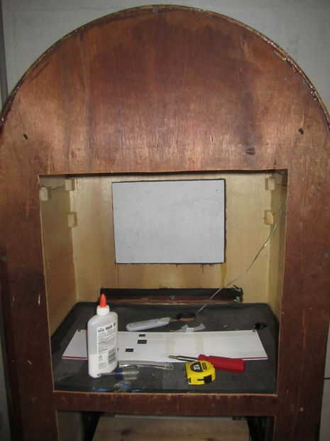 The Kickin' Kiosk is made of luan wood. Luan es ligero, barato y es algo así como caoba en grano y la mira. Solía luan madera y un carro de plástico utilidad para mantener el quiosco tan ligero como sea posible para que fácilmente puedo recoger y transportar la rockola a una fiesta. La base del kiosko es tres niveles carro para uso general de plástico, el carro es de estantes de plástico duros y las piernas que hace que sea fácil atornillar madera para este proyecto. El carro para uso general es 33 1/2" alto, 24" de ancho, por 18" de profundidad y el estante central es movible para ajustar la altura de la PC y componentes estéreo. El primer paso es cortar la madera de Luan en los lados que se utilizará para el jukebox y atorníllelos en el carro. Para los paneles laterales L y R; cortar dos 20" de alto por 18" piezas anchas de luan de una de las hojas de 4' X 8'. Para los paneles frontal y posteriores; cortar dos piezas de 56" de alto por 24" de ancho de las hojas restantes de 4' x 8'. Necesita redondear la parte superior de la frente y paneles en forma de un arco por el uso de un patrón de cartón, compás, o colocando una cadena a un clavo de aproximadamente 12" hacia abajo desde la parte superior centro luego conecte un lápiz al otro extremo y siga el arco crea para marcar la zona a cortar. Piezas delanteras y traseras juntas y cortadas con que el arco con un jig vio a través de ambas piezas para que coincida la abrazadera. Apoyo uno de lo 18" lado ancho paneles junto al lado ancho de 18" de la utilidad del carro y tornillo en el lado del estante plástico inferior, luego en el estante plástico superior con al menos 2 a 4 tornillos por estante para asegurarlo. Asegúrese que el lado más suave acabado de la luan hacia el exterior. Repita el proceso para el otro lado y los paneles frontales y posterior. Pegue unos pequeños bloques de chatarra madera en las esquinas donde sea necesario para asegurar los paneles juntos. Encolar y atornillar algunos bloques en el borde superior del arco en el interior de los paneles delanteros y traseros ayudará a alinear y asegurar la tapa curvada superior a jukebox cuando curva en su lugar más adelante. Marque y corte la abertura en el panel posterior de su armario con una sierra caladora para permitir que su equipo en. Marque y corte la abertura en la parte frontal del gabinete para coincidir con el tamaño de la pantalla de sus monitores. Asegúrese de medir correctamente desde el borde superior de la plataforma del carro superior. Mi apertura fue cortado a 13 1/4" de ancho por 10" de alto y 5 1/2 pulgadas desde el estante del carro superior. Corte otra abertura en la parte delantera a la altura del estante superior (mi estante superior es 29" desde el fondo de mi frente madera), hacer la parte inferior de esta abertura quede al ras con el estante superior para que el teclado puede poner en él cuando se insertan a través de la apertura. Hacen de esta apertura 17 1/2" de ancho por 1 3/4" de alto para sostener el teclado del ordenador más adelante.