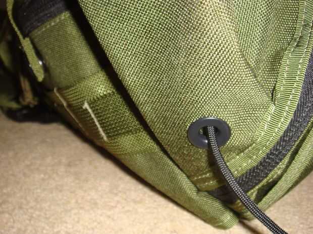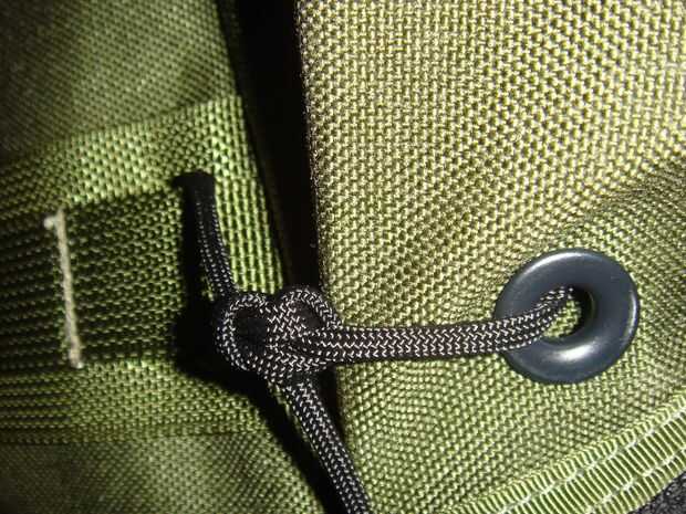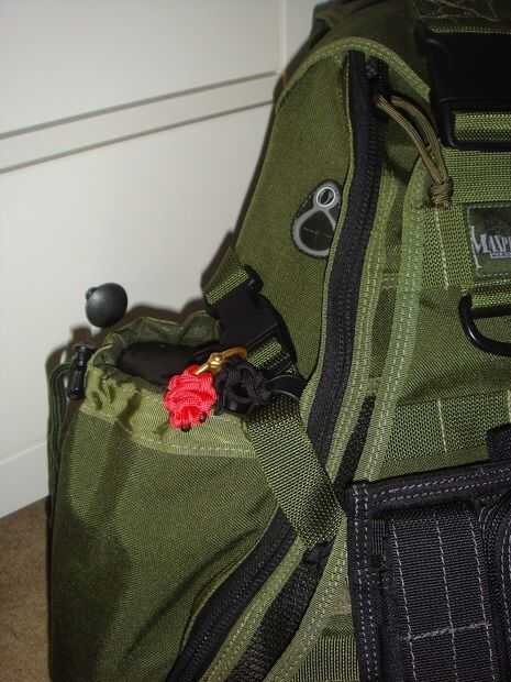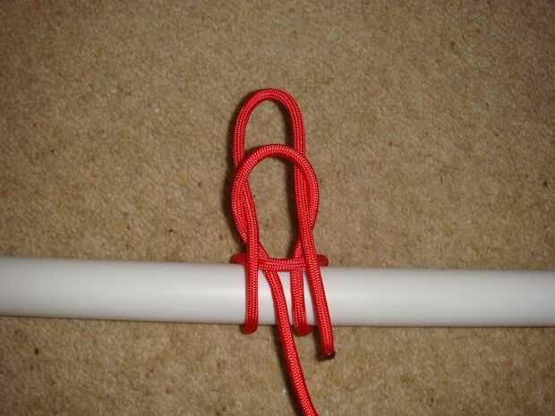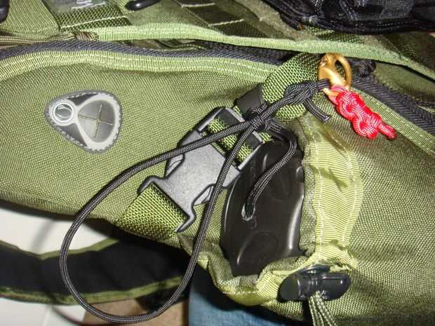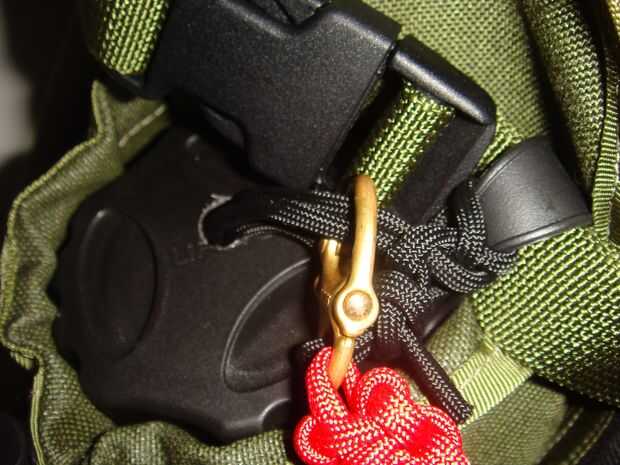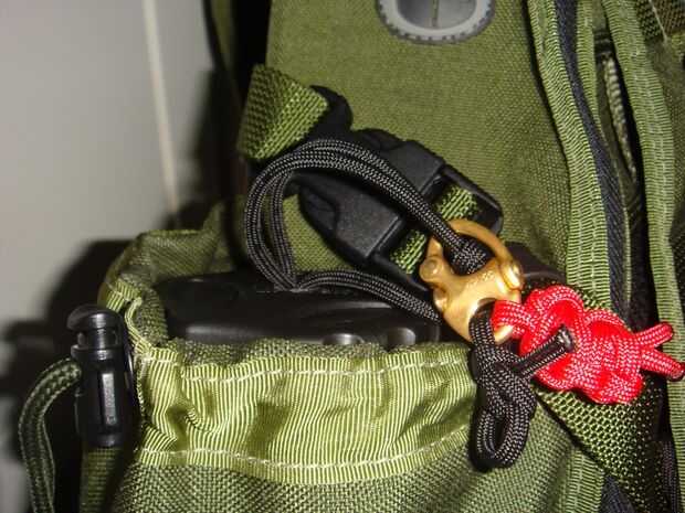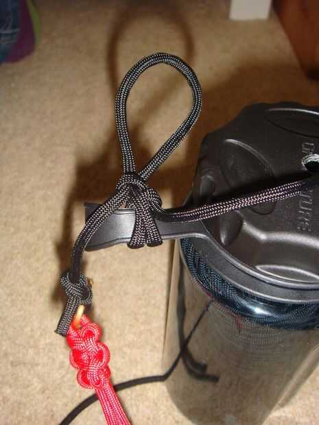 Para esto utilicé un nudo llamado enganche de bandolero. Su para asegurar supuestamente un caballo en el salvaje oeste, el caballo puede tirar duro en una final y no salen y el jinete puede tirar una vez en el otro que caen lejos para un conseguir rápido. Básicamente hacer un lazo detrás de un poste, pase el extremo largo (el que está que quieren moverse y van a tirar) a través del lazo, luego pase el extremo corto (uno que lo deshace) a través del segundo bucle. Apriete todo y su hecho, lo hice en la correa que sostiene la tapa en su lugar solo para que el cable no soltarse accidentalmente y sin querer desentrañar. Entonces tomé al final del enlace (el uno en el orificio inferior de la botella) y pasa a través del ojal del drenaje de la cavidad de la botella de agua. Luego fijarla a otra cinta para que no puede ir a cualquier parte, no con un nudo de tope, debe ser un lazo de desplazamiento no!