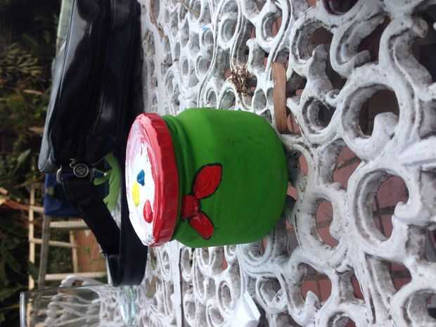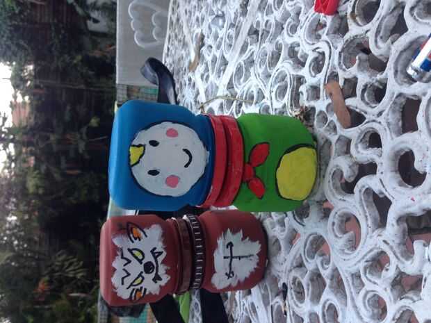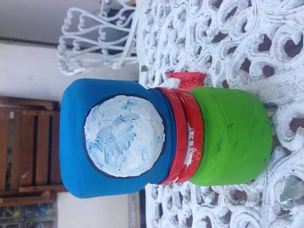 a continuación buscamos para unirse a los dos tarros tan. Terminamos la parte inferior de la pintura. Añadí a un nudo por lo que parecía una bufanda. y un delantal.