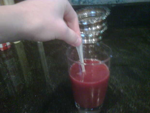 Verter al batido en la sosa, removiendo a medida que avanza. Remover hasta que forme una pequeña espuma en la parte superior.