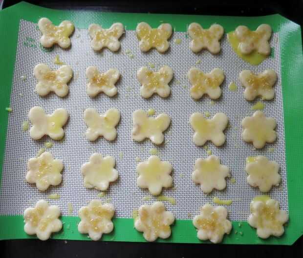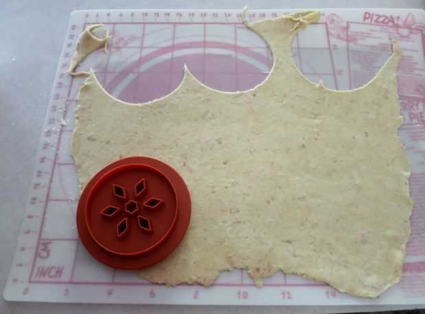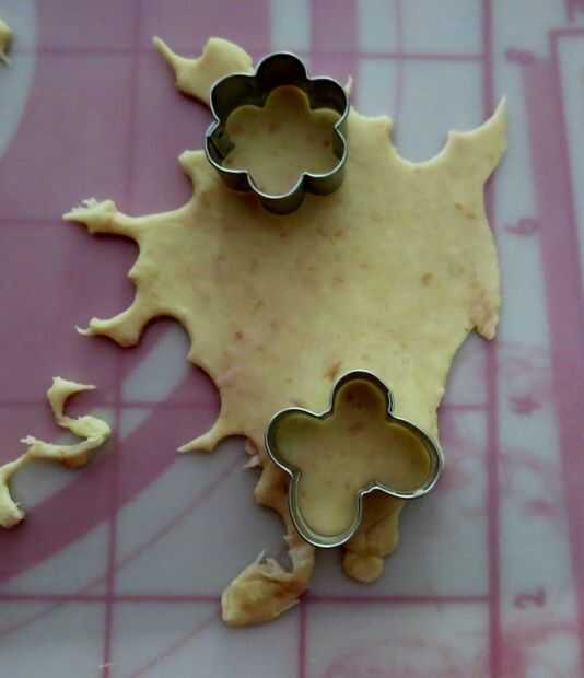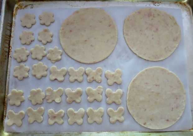 Si utiliza hojas de corte de cookie, utilice cortadores galleta pequeños para cortar tantas piezas como sea posible de la masa restante. Juntar los restos de una vez, pero no volver a rodar más de una vez como la masa se volverá difícil. Generalmente como hacer extra como galletas de masa de pastel, si tienes más de lo necesario al comienzo los pies pongo en su propia placa para horno forrada con hornear por separado.