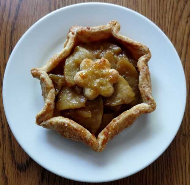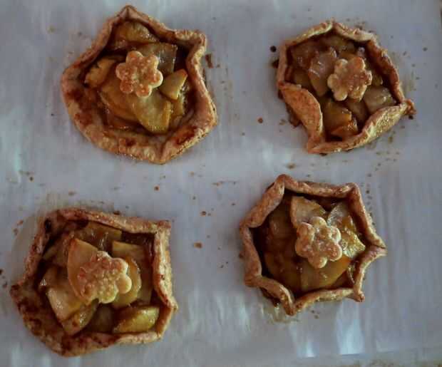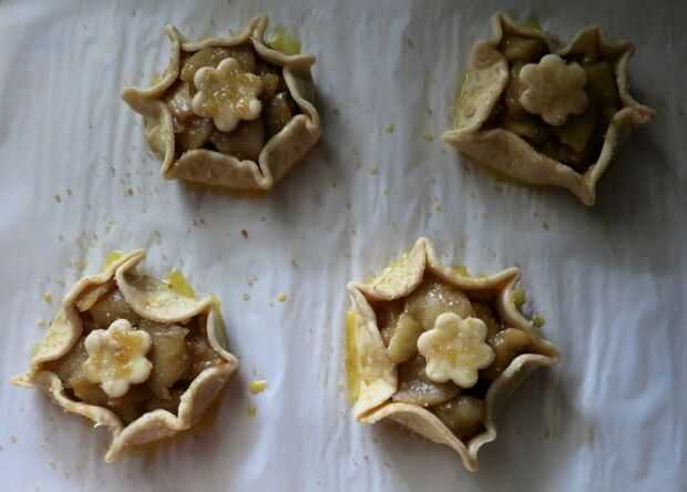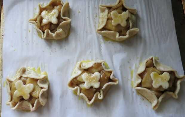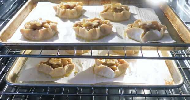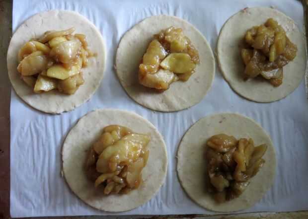Divida el relleno frío entre las rondas, dejando un borde de 1 pulgada. (frontera de 2 pulgadas si hacer dos tortas grandes.) Doble y plisado de la frontera para arriba y alrededor de las manzanas, dejando el centro libre. Si hiciste galletas cortes colocar uno o dos en el centro.
