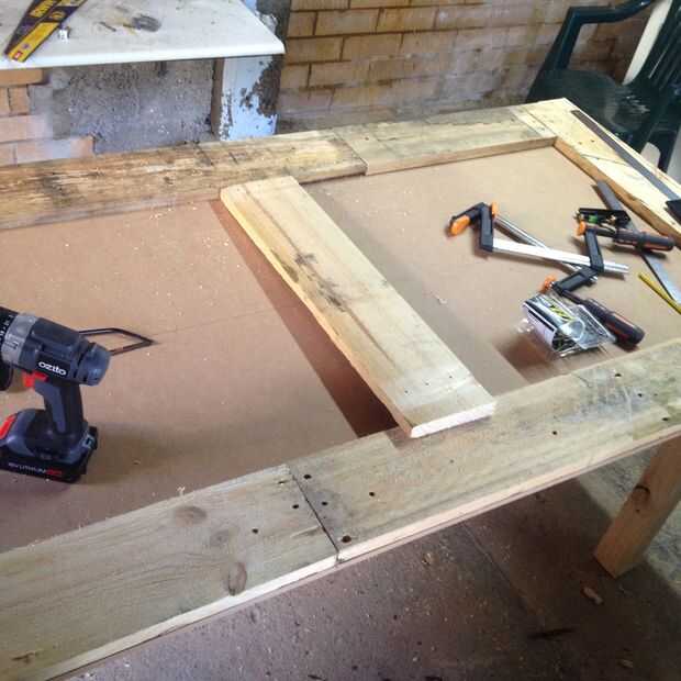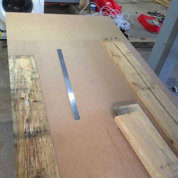 1. tomar ya sea el desarmado de pallets (desmontados antes de este paso:-)) o su acción terminó longitudes de madera de 100 mm de ancho y colócalas alrededor del borde externo del tablero MDF. Como se muestra en las imágenes.